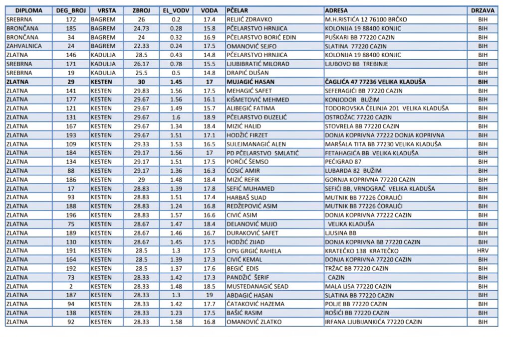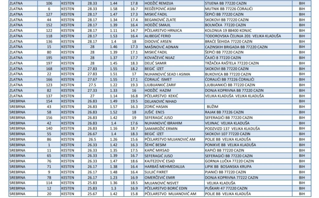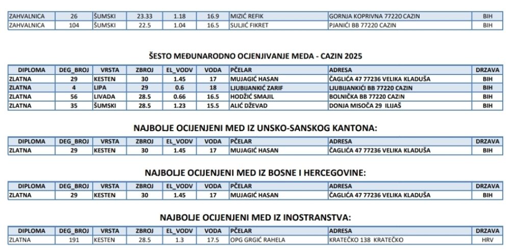 Dana 23.08.2025.godine u prostorujama UP Kesten u naselju Mala Lisa, grad Cazin završeno je Šesto međunarodno ocjenjivanje meda Cazin 2025 kojom prilikom je međunarodna senzorna komisija izvrsila ocjenjivanje 180 prispjelih uzoraka koji su dosli iz cijele BiH, Makedonije, Austrije i Hrvatske. Zahvaljujemo se svim pčelarima koji su dostavili svoje uzorke na takmičenje i čestitamo im na osvojenim priznanjima.